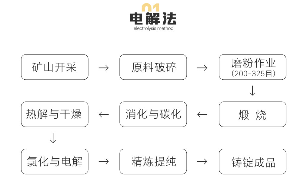 礦山開采→原料破碎→磨粉作業(yè)(200-325目)→煅燒→消化與碳化→熱解與干燥→氯化與電解→精煉提純→鑄錠成品